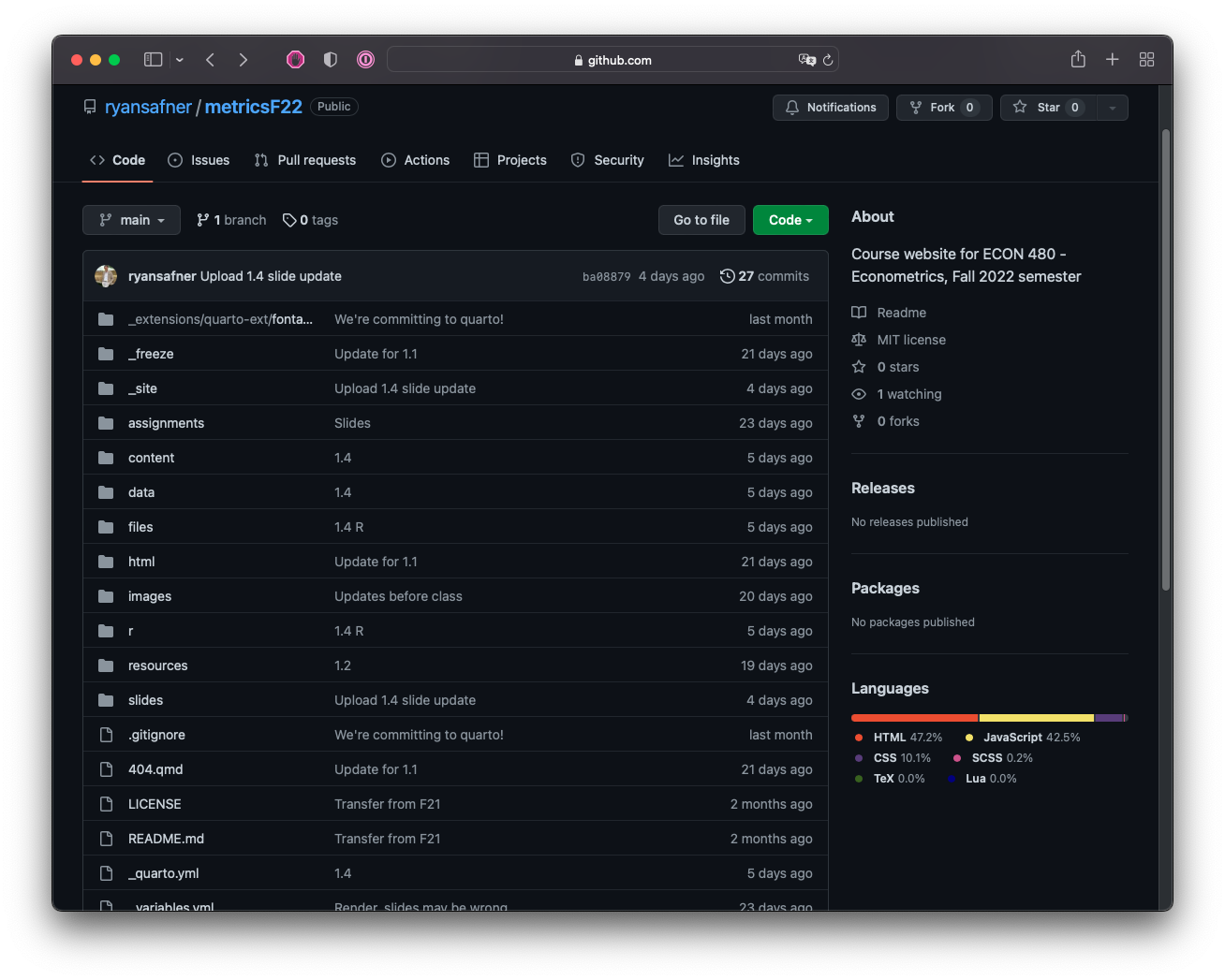 df <- read_csv("data/my_data"); save plots like ggsave("figures/p.png")pdf or html.stage and commit changes with a description, push to GitHub.