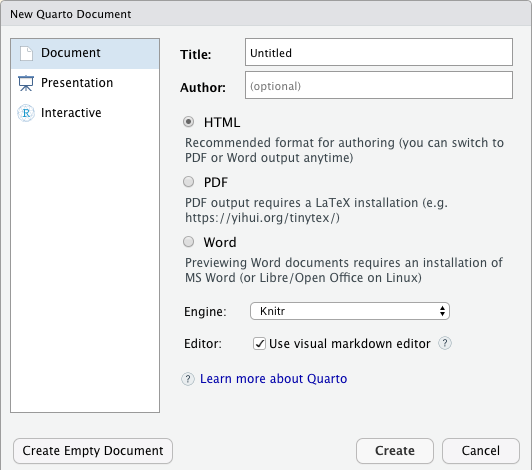 knitr1, an R package that “knits” your R code and markdown .qmd into a .md file for: