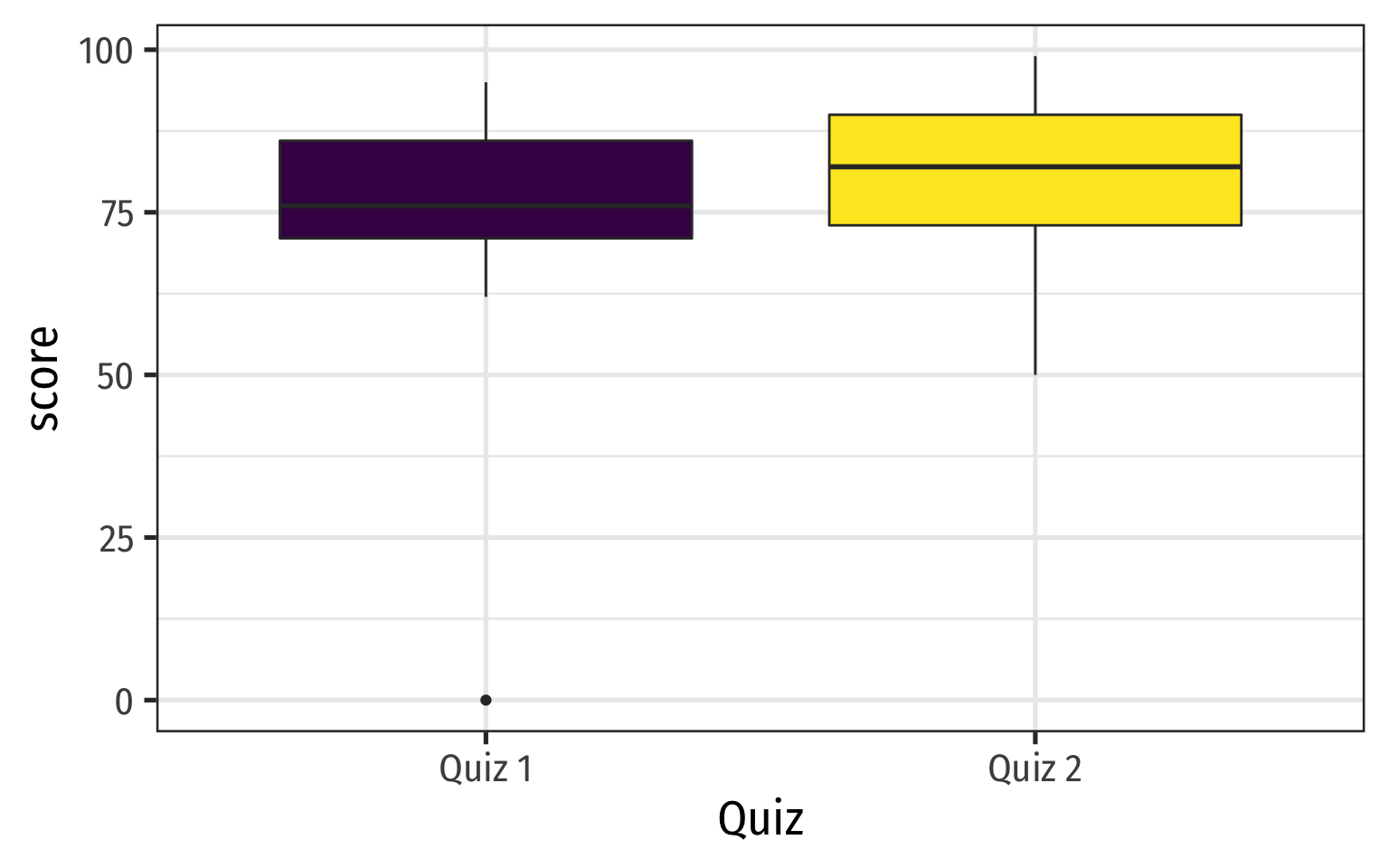 Quiz 1:{0,62,66,71,71,74,76,79,83,86,88,93,95}Quiz 2:{50,62,72,73,79,81,82,82,86,90,94,98,99}