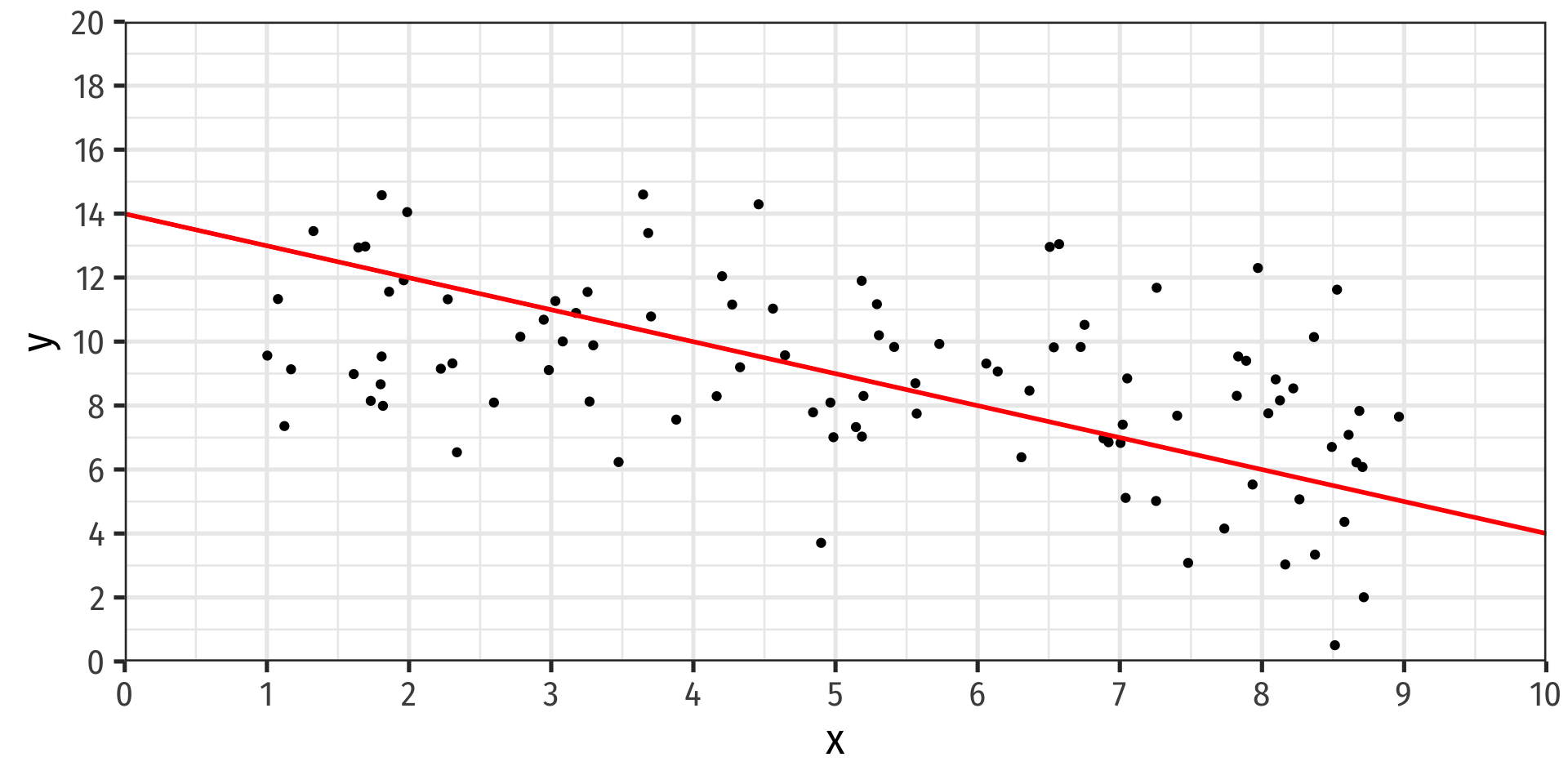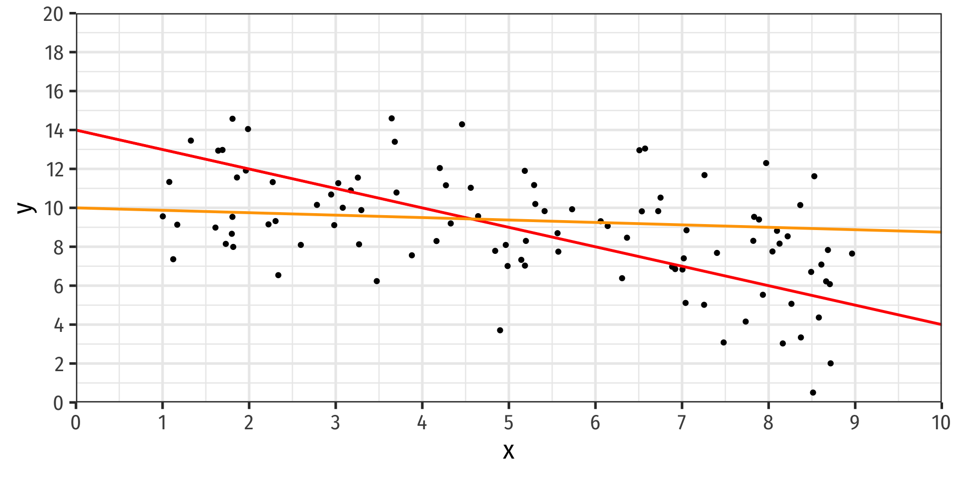 \(\text{slope}=\frac{\Delta Y}{\Delta X}\): for a 1-unit change in \(X\), how many units will this cause \(Y\) to change?