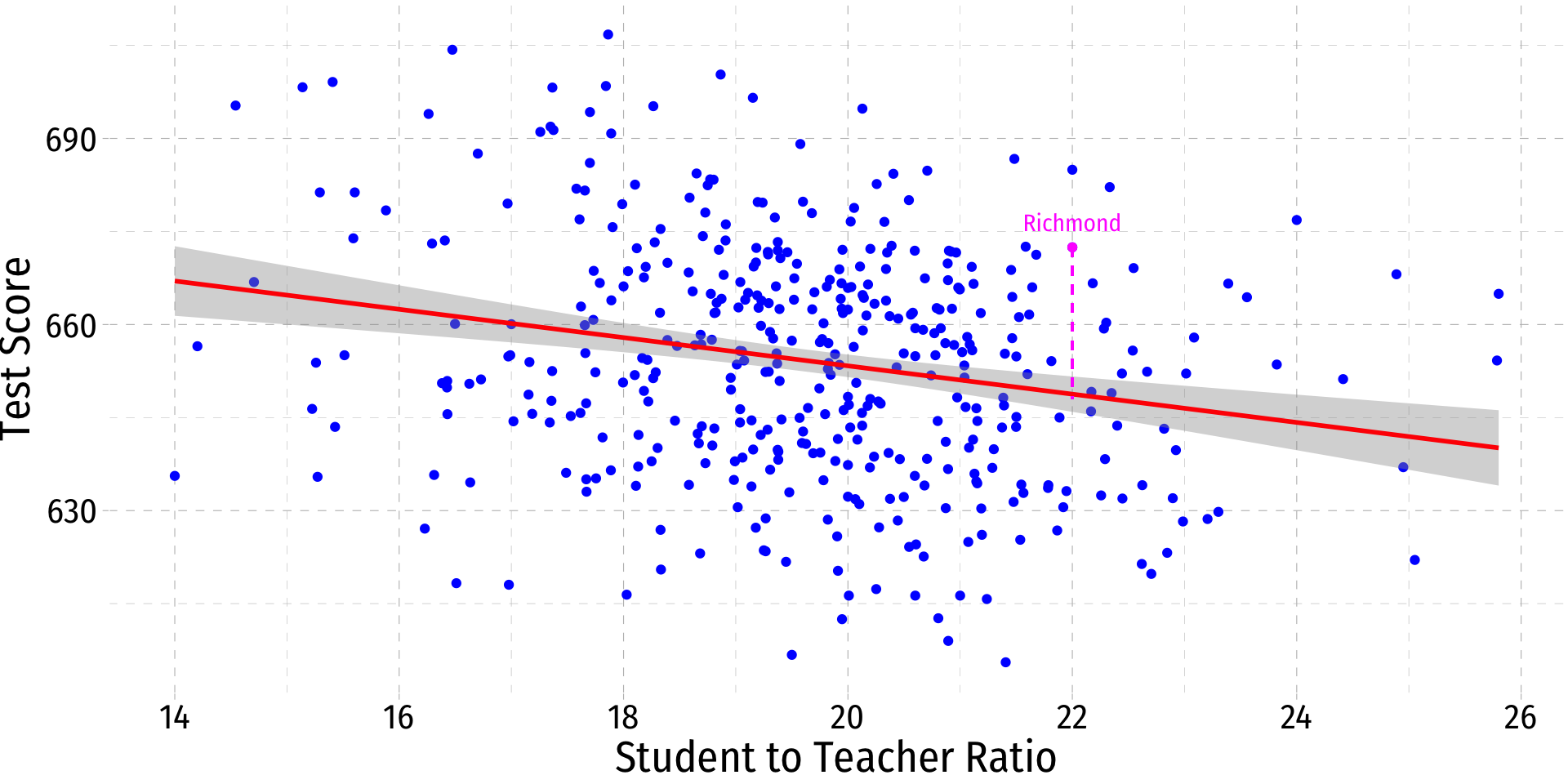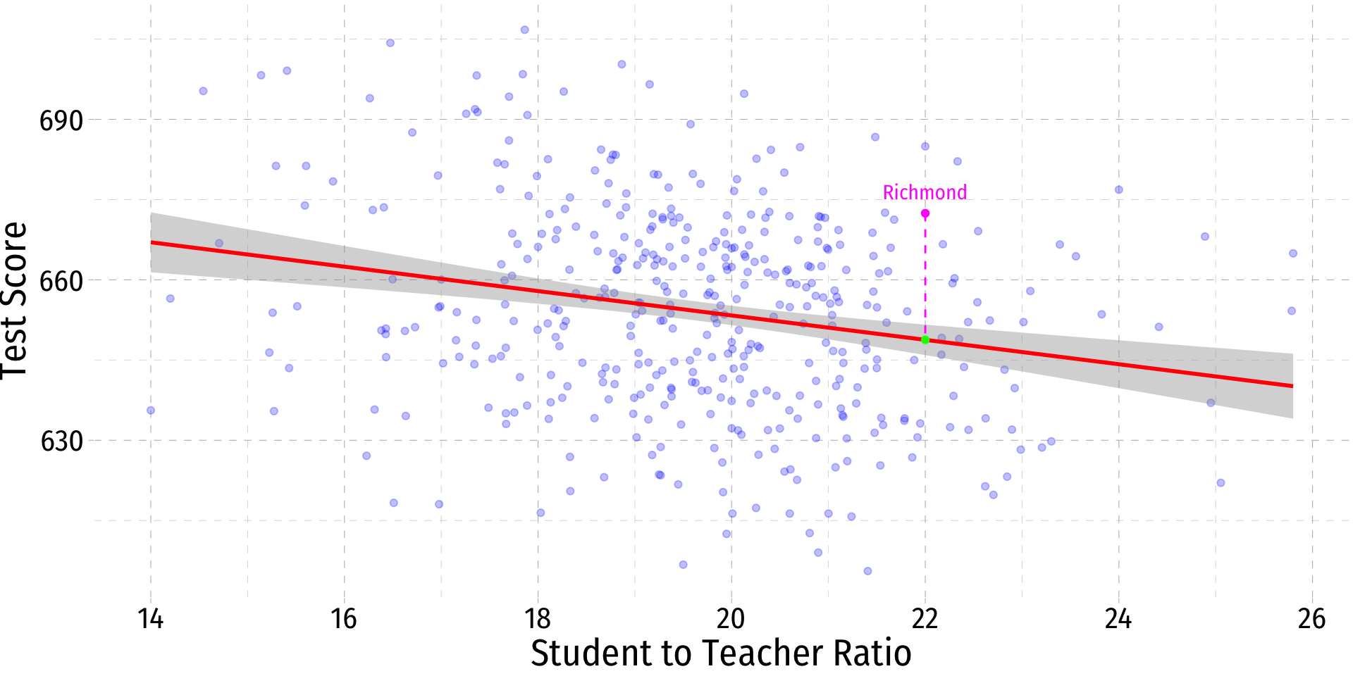 .fitted value:\[\widehat{\text{Test Score}}_{\text{Richmond}}=698-2.28(22) \approx 648\]