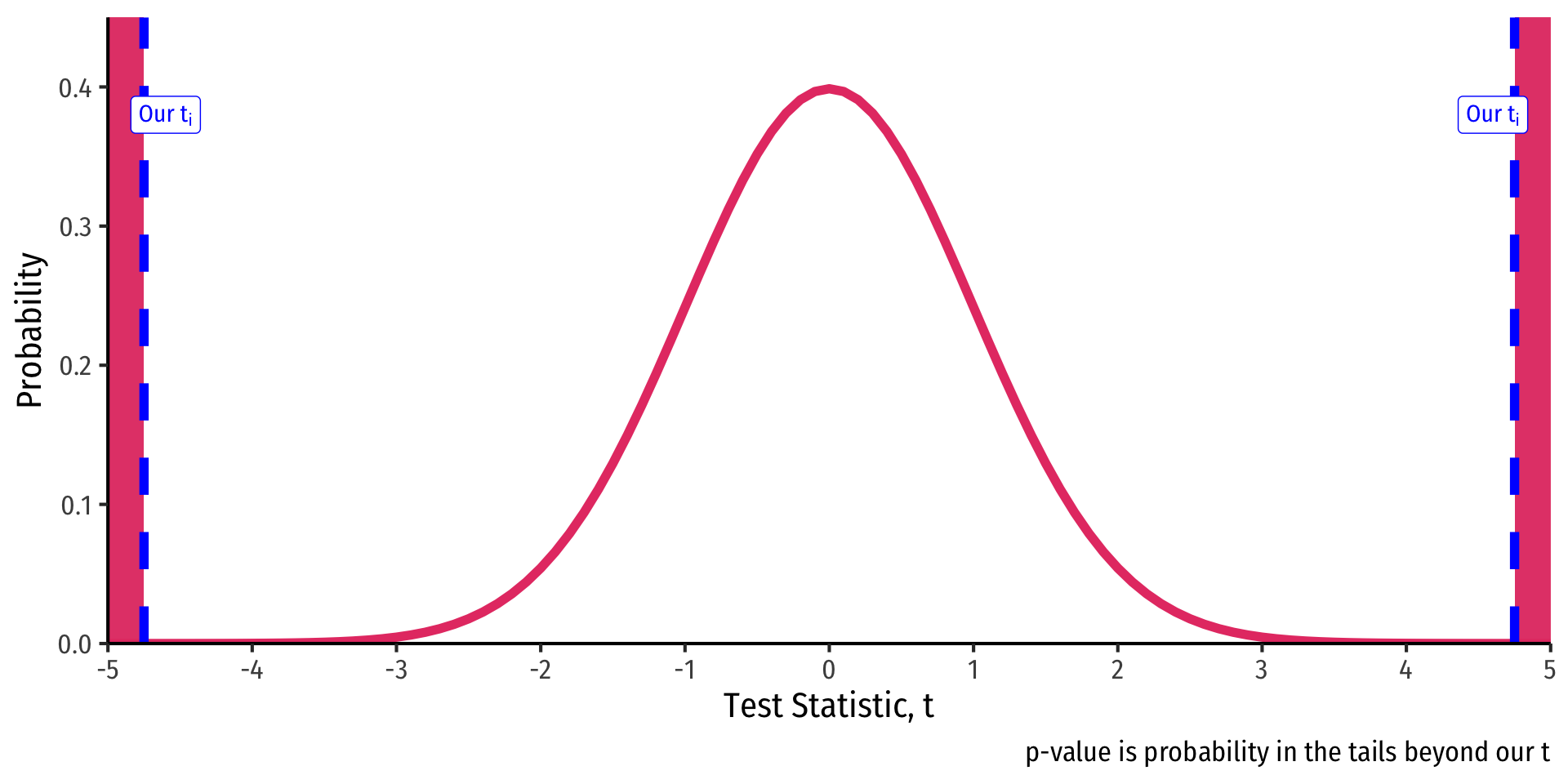 • Again, p-value is the probability that, if the null hypothesis were true, we obtain (by pure random chance) a test statistic at least as extreme as the one we estimated for our sample