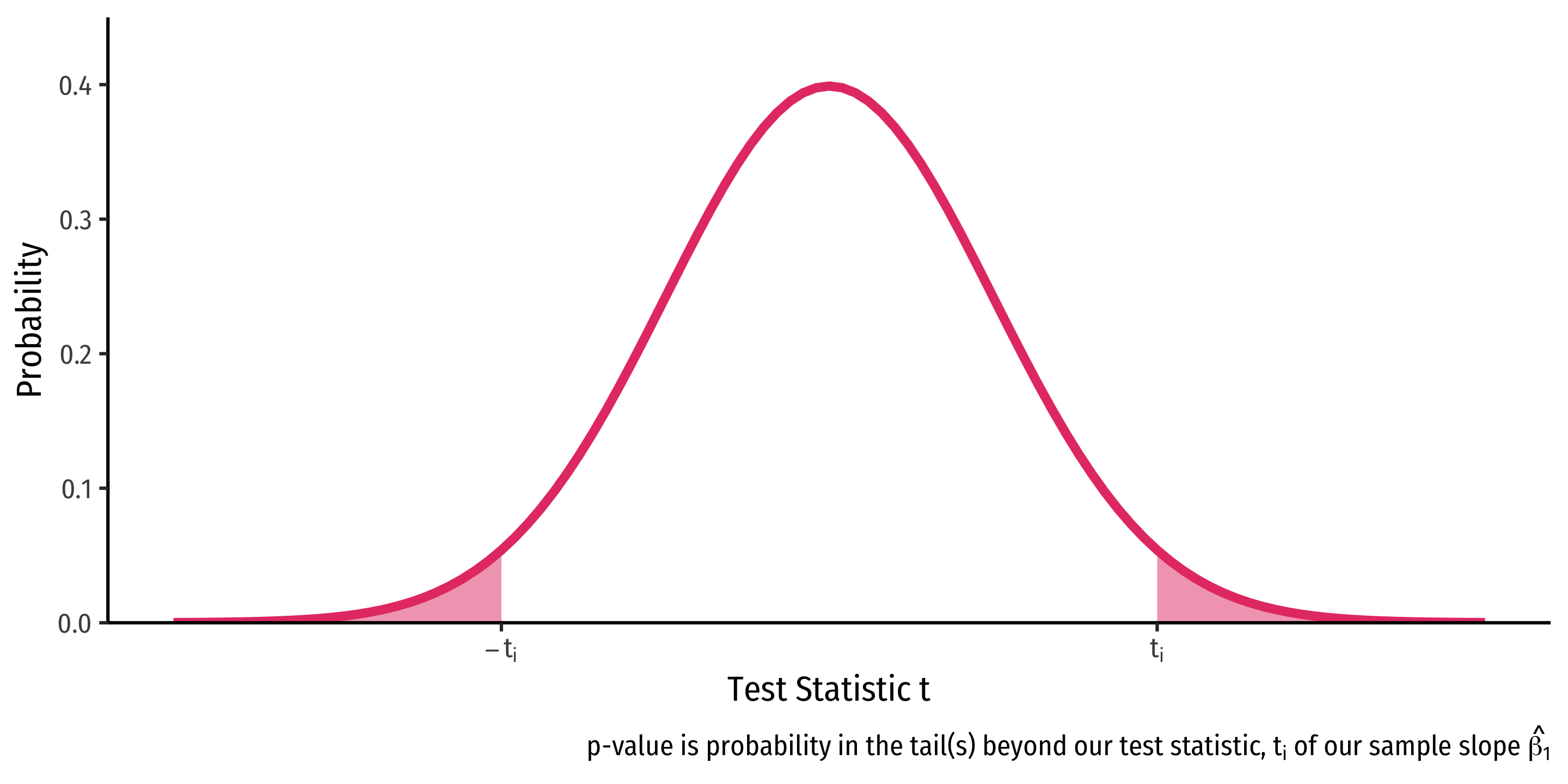 ❌ p is the probability that the null hypothesis is true - We’re not proving the H0 is false, only saying that it’s very unlikely that if H0 were true, we’d obtain a slope as rare as our sample’s slope